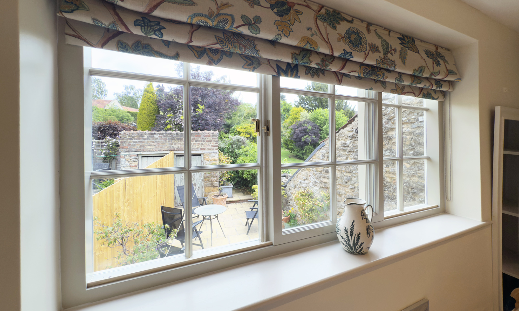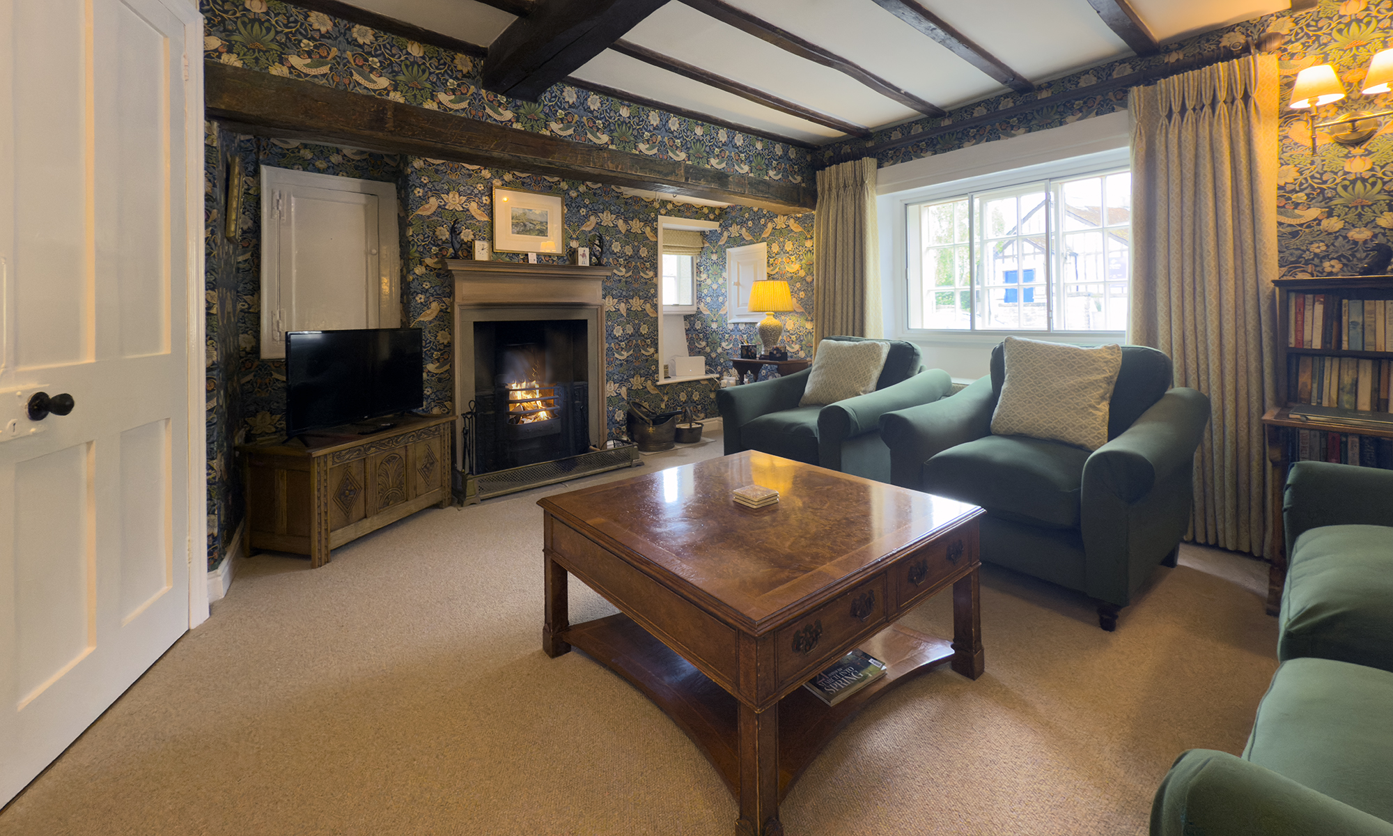 Open fireplace with basket grate, (first basket of logs kindling and coal provided); beamed ceiling; double glazed sliding sash window; TV