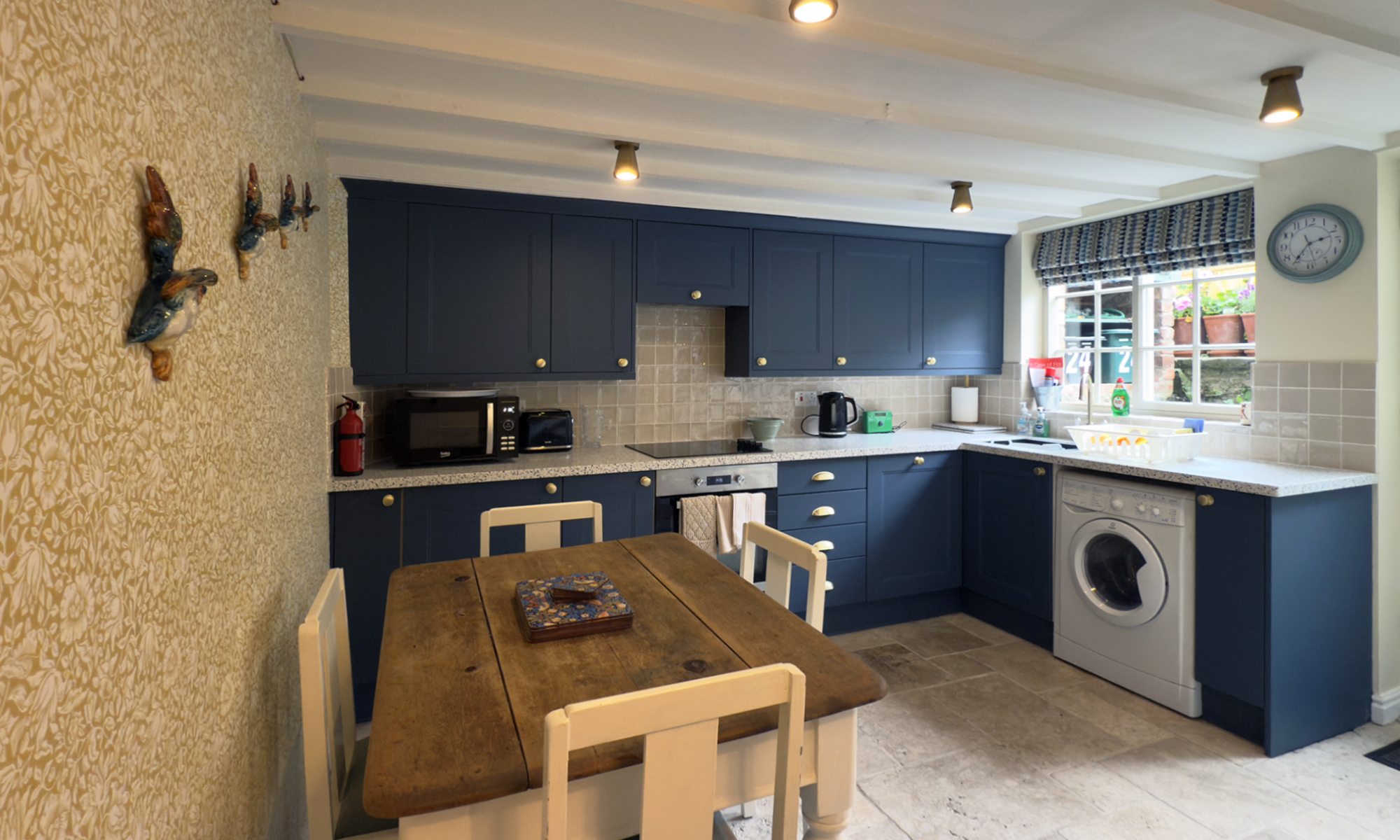 Excellent range of modern fitted cupboards; heat resistant work surface with tiled splash; fully equipped with electric cooker, microwave, small fridge, fridge-freezer, dish washer and washing machine; door to small paved garden at the rear of house providing a sitting-out area