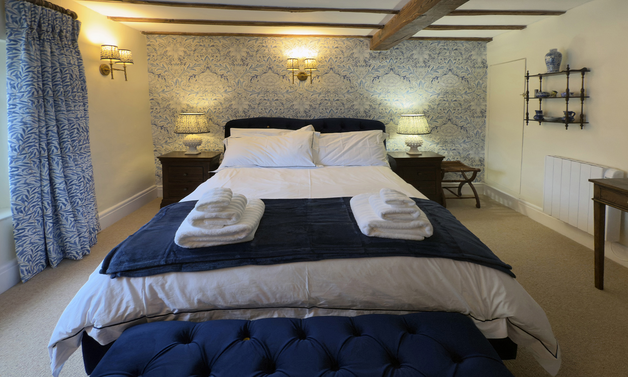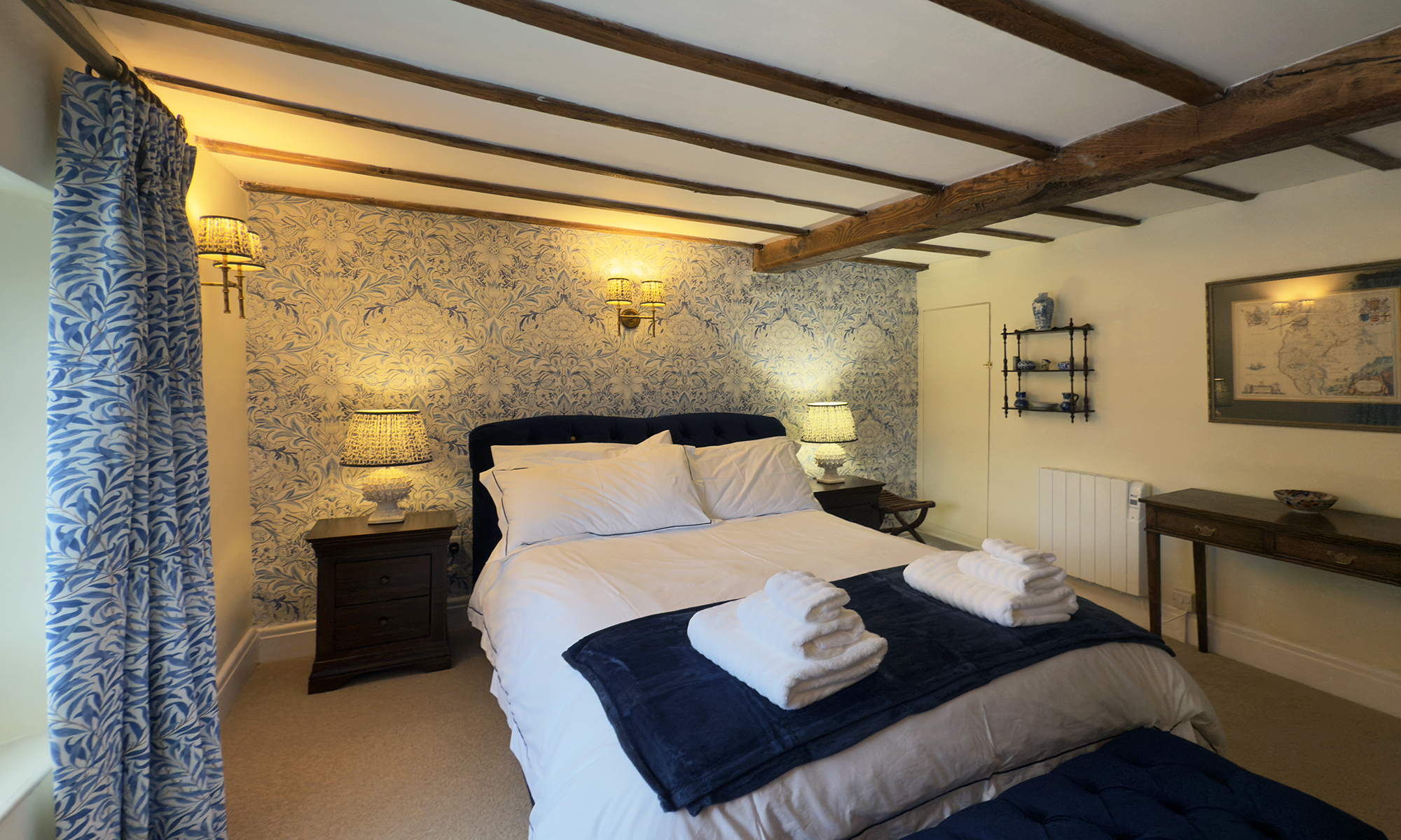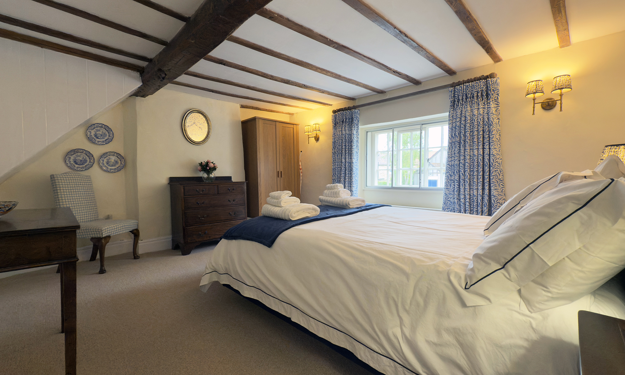 Beamed ceiling; king-sized bed; sliding sash window with secondary double glazing; chest of drawers and wardrobe