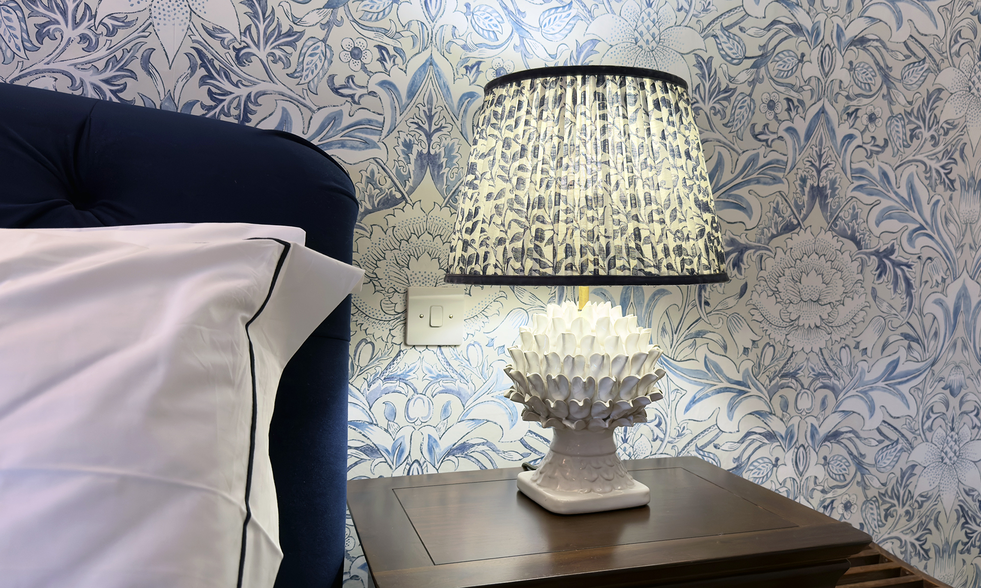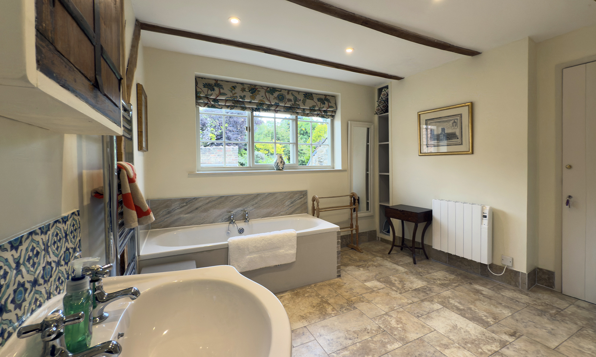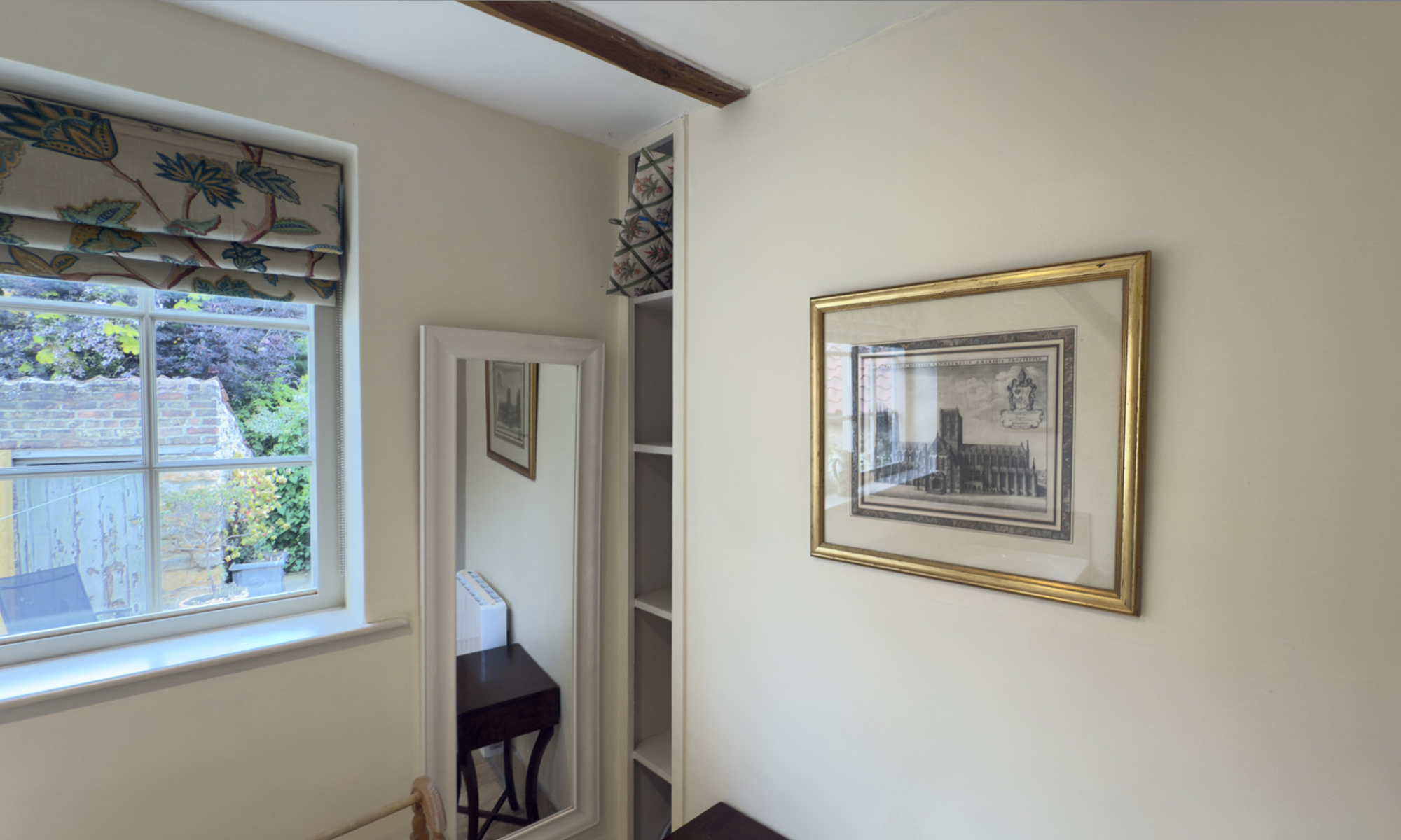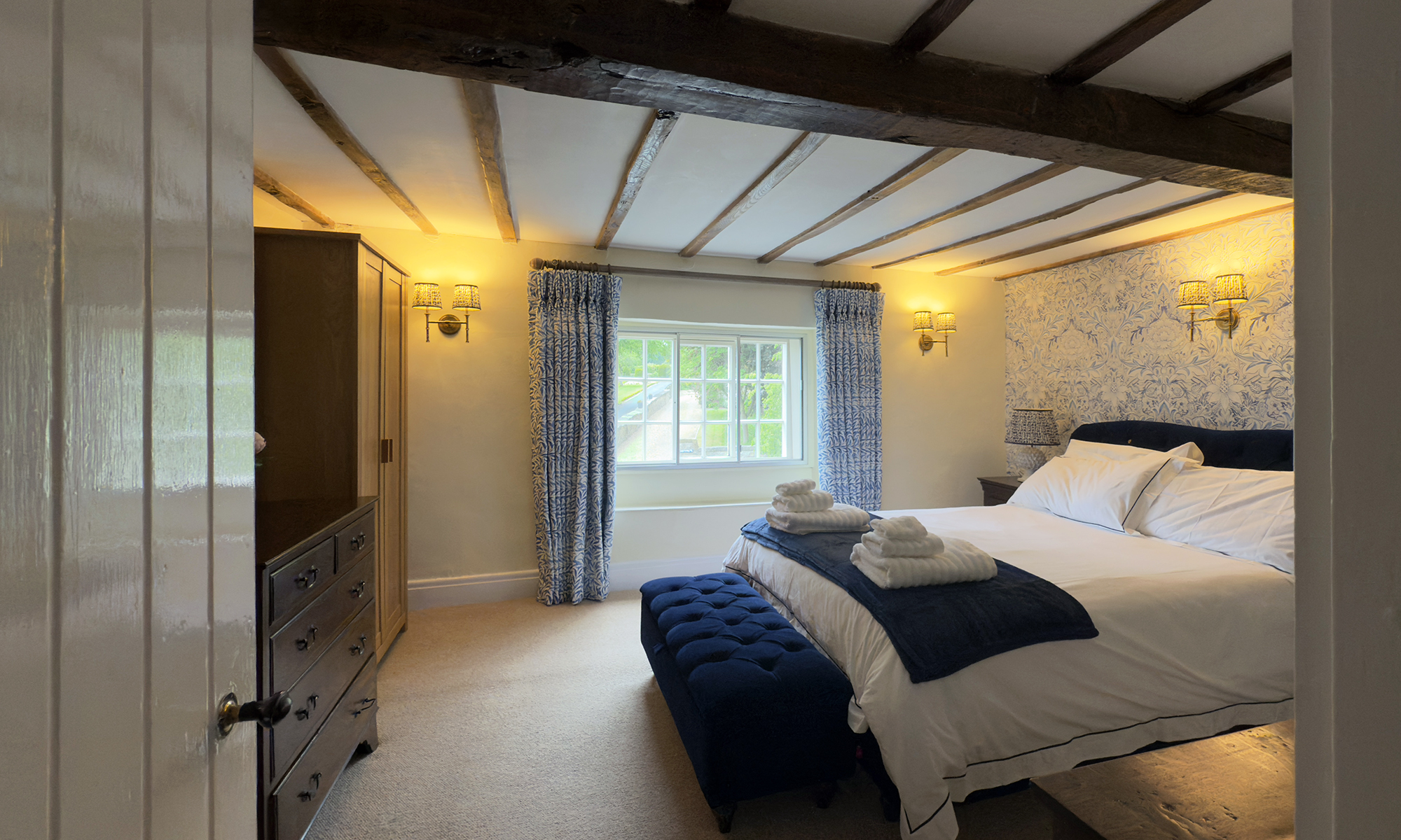 Beamed ceiling; king-sized bed; sliding sash window with secondary double glazing; chest of drawers and wardrobe