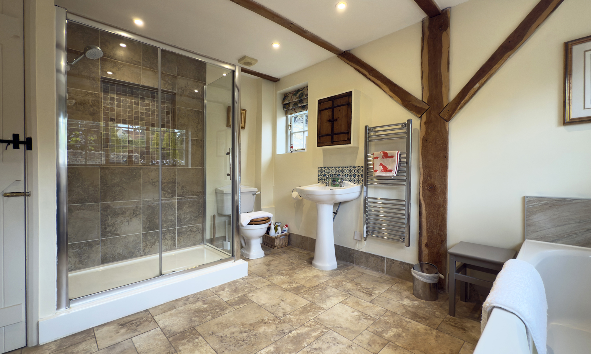 Large contemporary-style bathroom with walk-in shower; tiled floor; panel bath; WC and hand basin; recessed lighting and heated towel rail