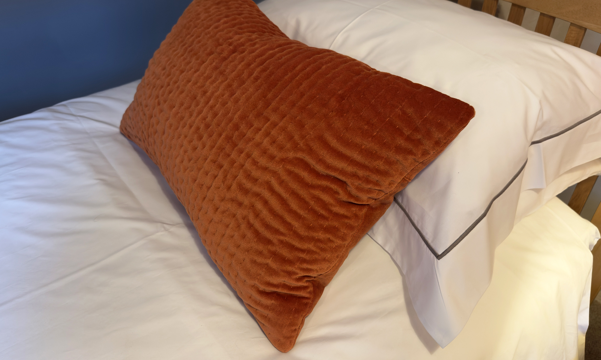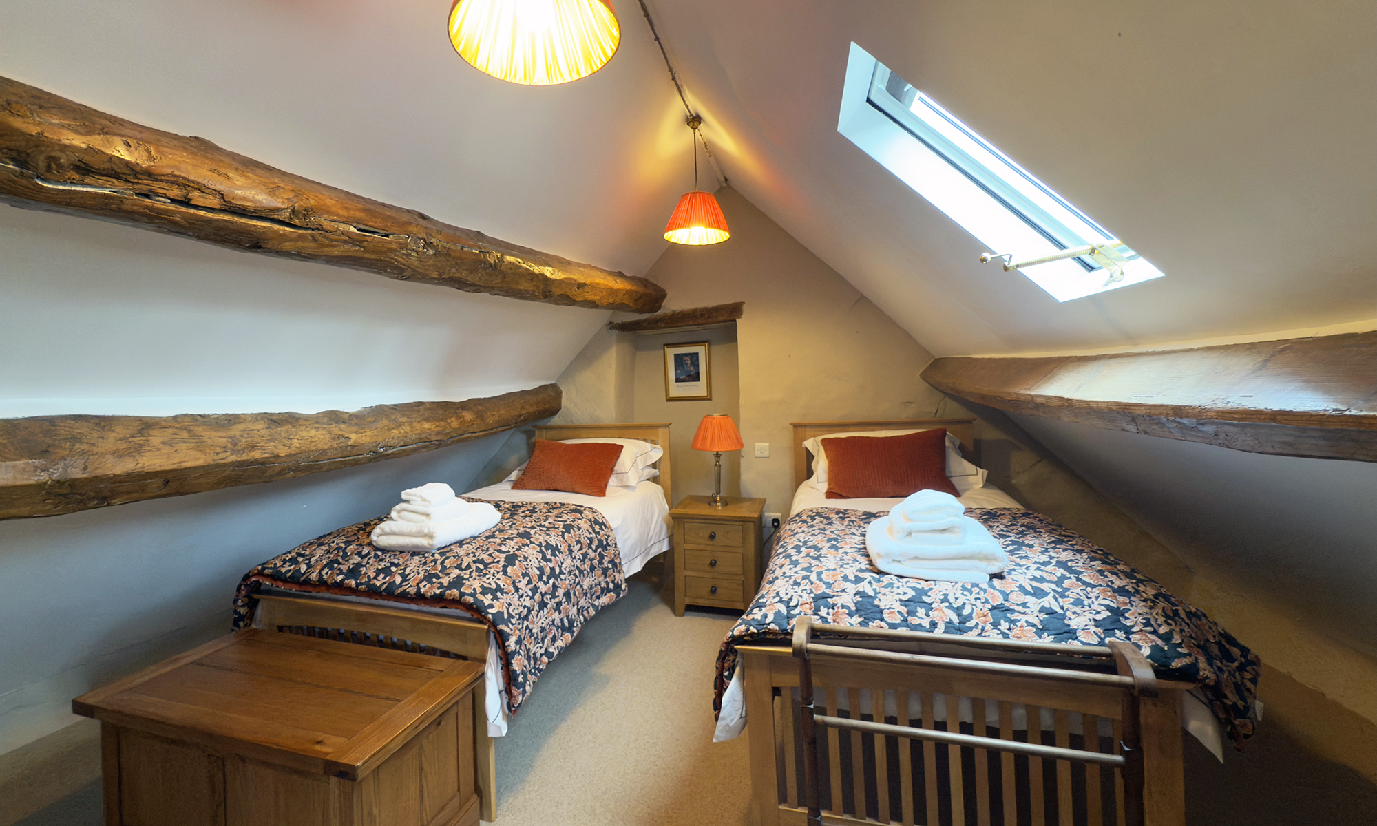 Attic bedroom with beamed ceiling; Velux roof light; twin single beds; chest of drawers. Please note that the bedroom is open to the stairs and as a result we say that cottage is not suitable for children under the age of seven